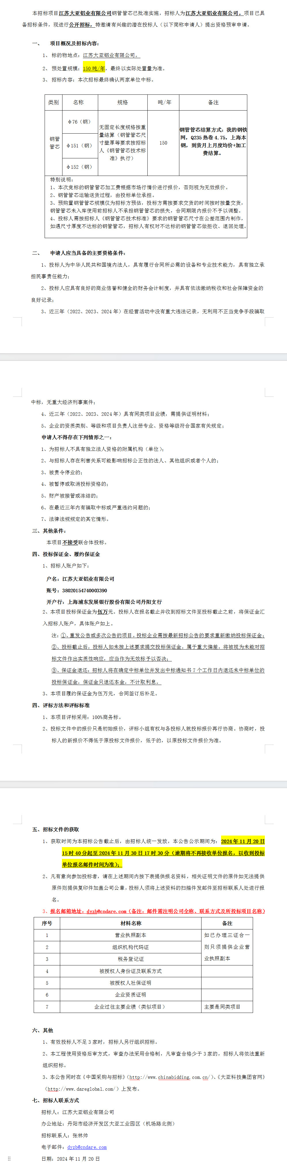 江蘇大亞鋁業有限公司鋼管管芯招標公告