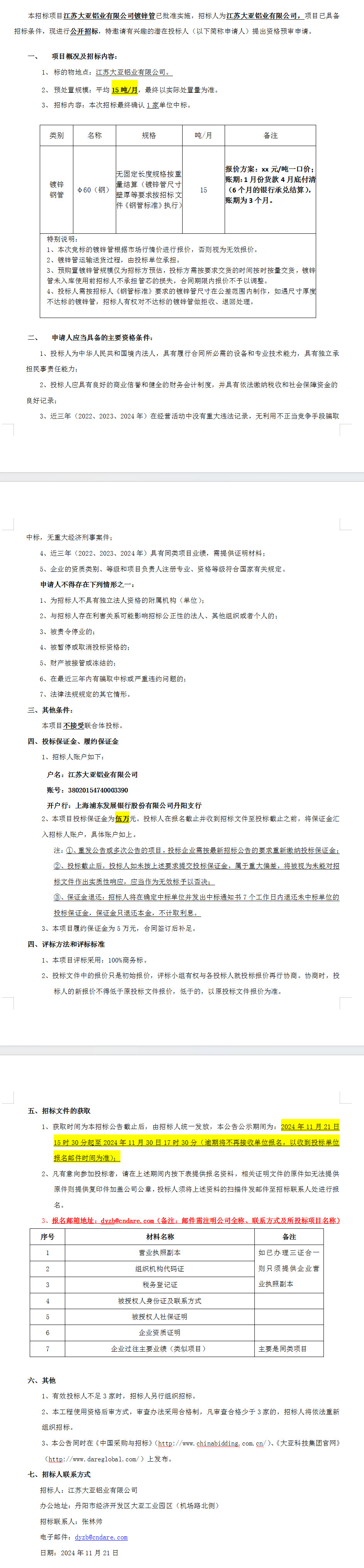 江蘇大亞鋁業有限公司 鍍鋅管招標公告