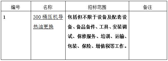 本招標項目壓機導熱油更換(項目名稱)已批準建設,招標人為大亞木業(茂名)有限公司,建設資金來自自籌 (資金來源)。項目已具備招標條件,現進行公開招標,特邀請有興趣的潛在投標人(以下簡稱申請人)提出資格預審申請。