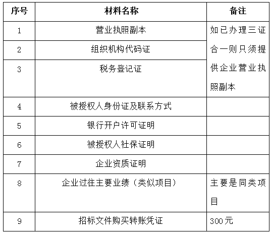 2、 凡有意向參加投標者,請在上述期間內按下表提供報名資料,相關證明文件的原件如無法提供原件則提供復印件加蓋公司公章,投標人須將上述資料的掃描件發郵件至招標聯系人處進行報名。