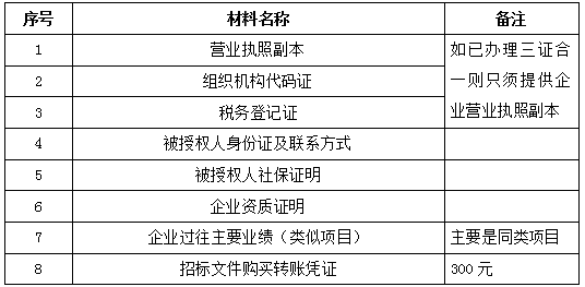 2、 凡有意向參加投標者,請在上述期間內按下表提供報名資料,相關證明文件的原件如無法提供原件則提供復印件加蓋公司公章,投標人須將上述資料的掃描件發郵件至招標聯系人處進行報名。