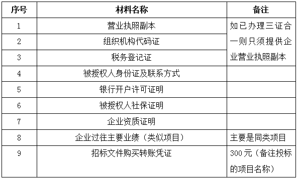 2、 凡有意向參加投標(biāo)者,請(qǐng)?jiān)谏鲜銎陂g內(nèi)按下表提供報(bào)名資料,相關(guān)證明文件的原件如無法提供原件則提供復(fù)印件加蓋公司公章,投標(biāo)人須將上述資料的掃描件發(fā)郵件至招標(biāo)聯(lián)系人處進(jìn)行報(bào)名。