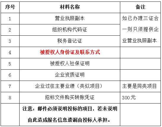 2、 凡有意向參加投標(biāo)者,請(qǐng)?jiān)谏鲜銎陂g內(nèi)按下表提供報(bào)名資料,相關(guān)證明文件的原件如無(wú)法提供原件則提供復(fù)印件加蓋公司公章,投標(biāo)人須將上述資料的掃描件發(fā)郵件至招標(biāo)聯(lián)系人處進(jìn)行報(bào)名。