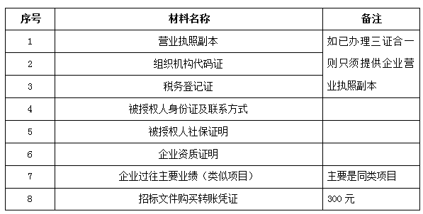 2、 凡有意向參加投標(biāo)者,請(qǐng)?jiān)谏鲜銎陂g內(nèi)按下表提供報(bào)名資料,相關(guān)證明文件的原件如無法提供原件則提供復(fù)印件加蓋公司公章,投標(biāo)人須將上述資料的掃描件發(fā)郵件至招標(biāo)聯(lián)系人處進(jìn)行報(bào)名。