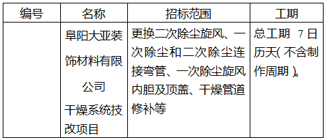 阜陽大亞裝飾材料有限公司干燥系統技改項目招標公告