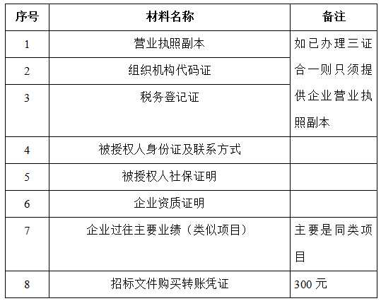 2、 凡有意向參加投標者,請在上述期間內按下表提供報名資料,相關證明文件的原件如無法提供原件則提供復印件加蓋公司公章,投標人須將上述資料的掃描件發郵件至招標聯系人處進行報名。