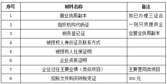 2、 凡有意向參加投標者,請在上述期間內按下表提供報名資料,相關證明文件的原件如無法提供原件則提供復印件加蓋公司公章,投標人須將上述資料的掃描件發郵件至招標聯系人處進行報名。