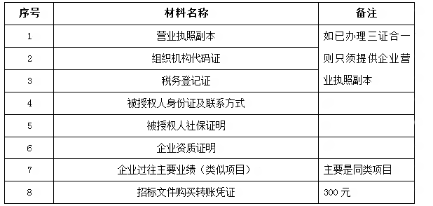 2、 凡有意向參加投標(biāo)者,請在上述期間內(nèi)按下表提供報名資料,相關(guān)證明文件的原件如無法提供原件則提供復(fù)印件加蓋公司公章,投標(biāo)人須將上述資料的掃描件發(fā)郵件至招標(biāo)聯(lián)系人處進行報名。報名電子郵件:dyzb@cndare.com