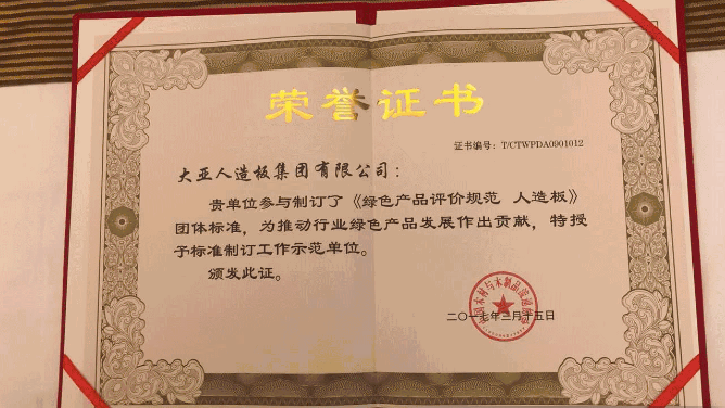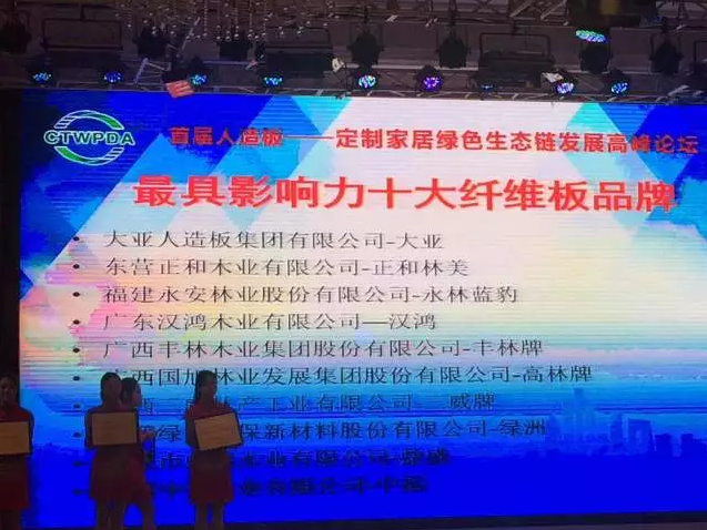 會(huì)上,中國(guó)木材與木制品流通協(xié)會(huì)隆重揭曉最具影響力十大纖維板品牌等獎(jiǎng)項(xiàng), 大亞人造板集團(tuán)有限公司(大亞牌)以優(yōu)秀的產(chǎn)品品質(zhì)、卓越的市場(chǎng)影響力榮膺十大纖維板品牌之首。該獎(jiǎng)項(xiàng)是對(duì)十幾年如一日專注于環(huán)保板材生產(chǎn)與流通的大亞人造板的充分肯定與鼓勵(lì)。