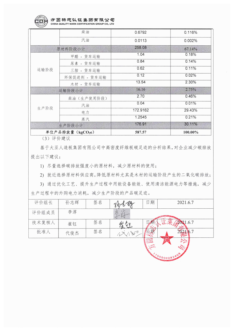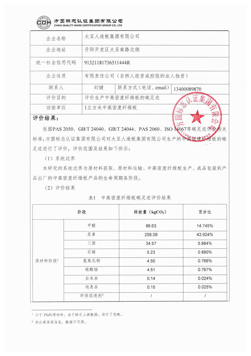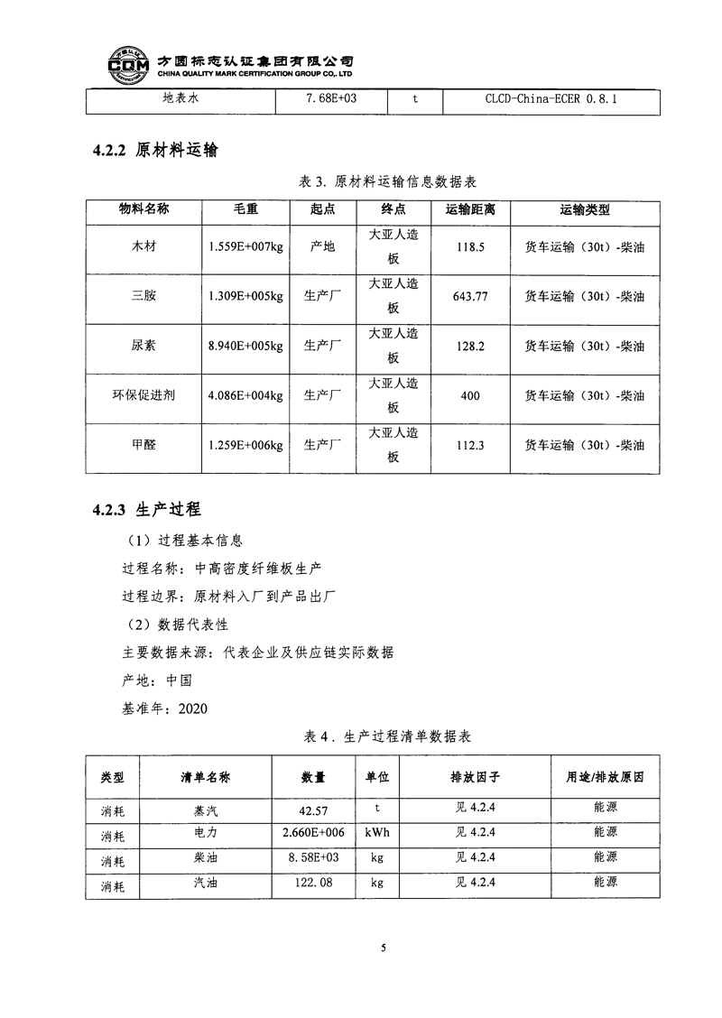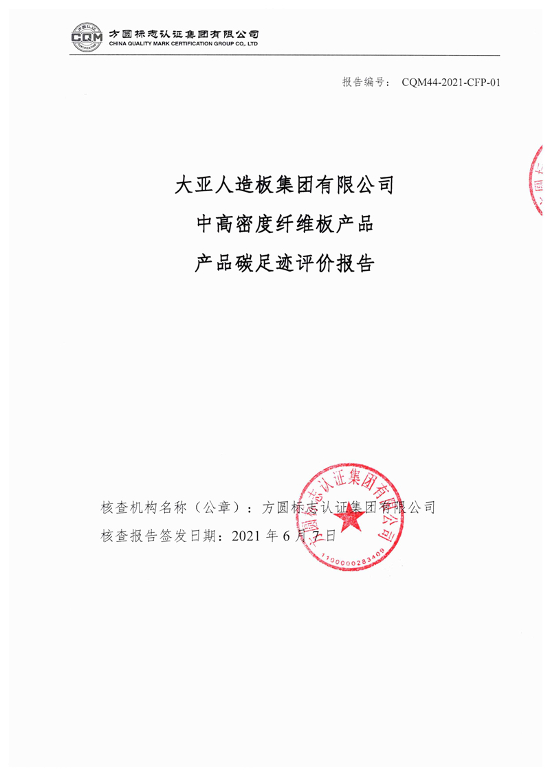 大亞人造板集團有限公司中高密度纖維板產品產品碳足跡評價報告自主公示